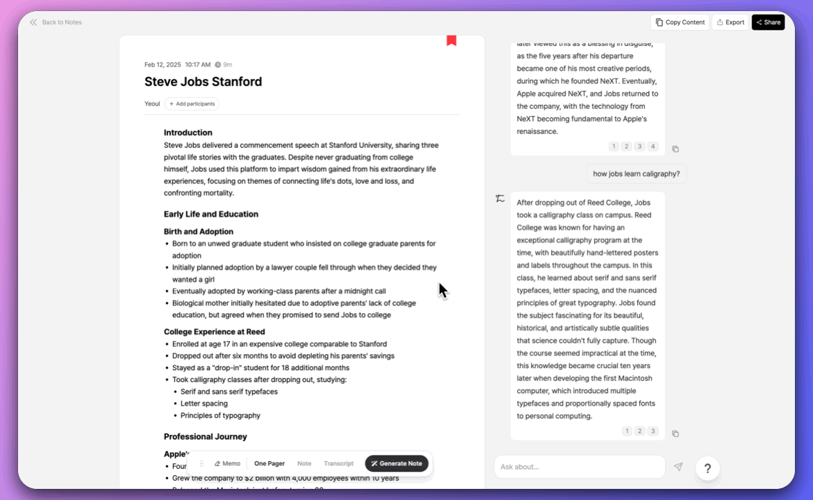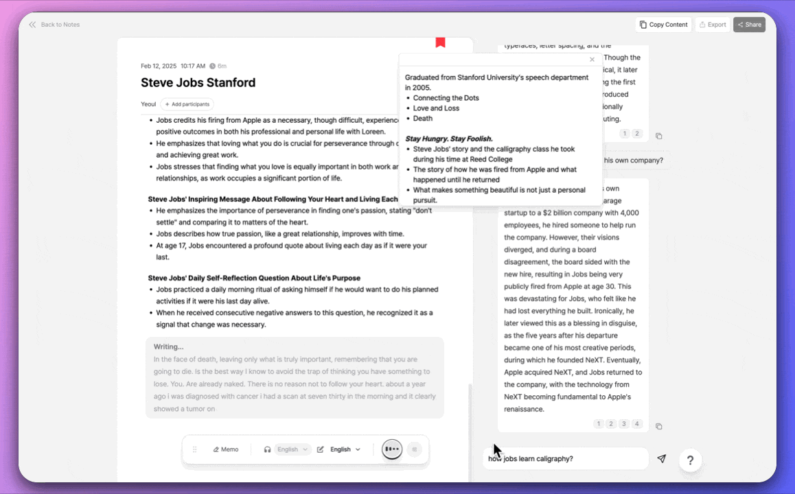 • After your conversation ends, our simple sharing features let you copy recorded content to your clipboard or share it instantly with team members. Experience more efficient conversation recording with our refreshed note page!